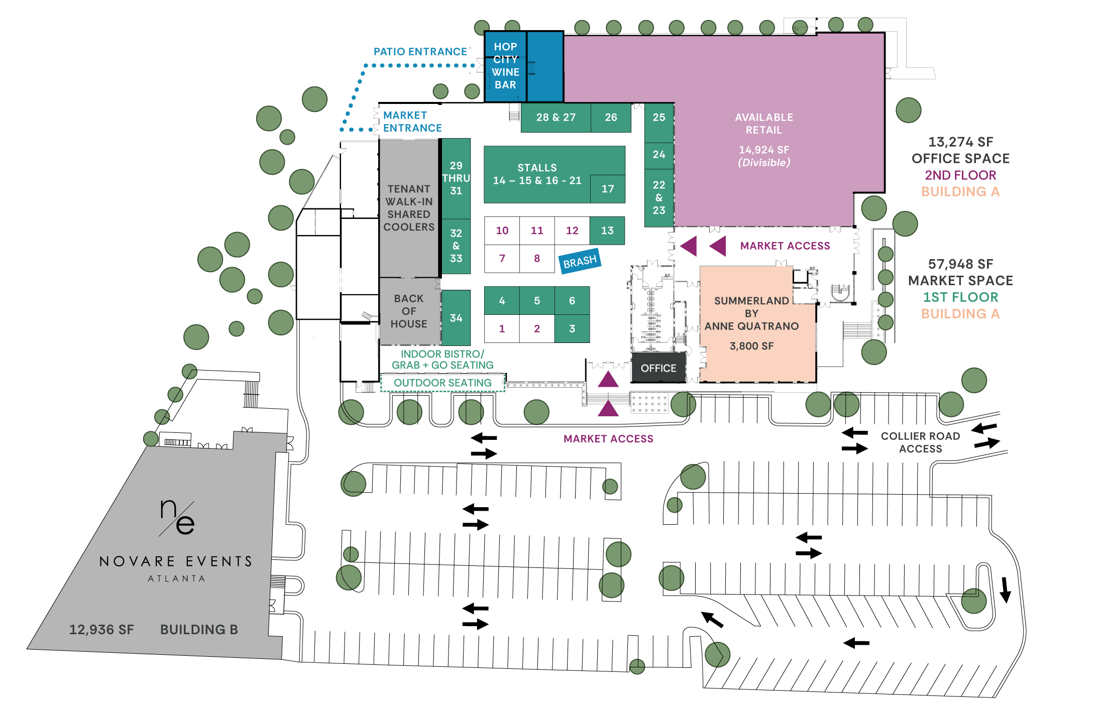 Upper West Market is not another food hall. It is a convergence of quality products and a commitment to supporting local communities and brands. Thirty three stalls - each exclusively for lease to local producers - fill the 9,000 square foot, open-air vendor area. While Building A’s first floor is reserved for local products, the second floor’s three suites, 13,000 square foot mezzanine level is available for office tenants.